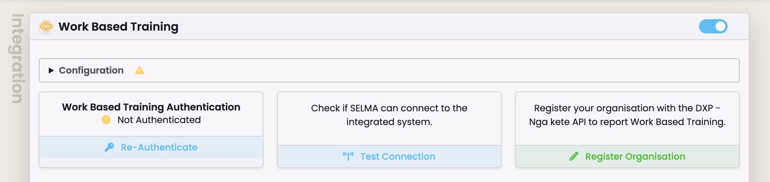 To submit delivery data related to Work-Based learning, you must request the Work Based Training Integration in SELMA. This integrations enables real-time data sync between DXP Ngā Kete and SELMA, via the WBT API.